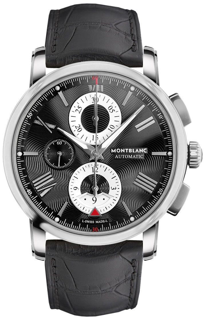 MontBlanc 4810 Chronograph Automatic 115123 men's watch. Features a polished stainless steel case and black Leather Strap with Pattern. The thin bezel has a satin-finished border. The black guilloche dial features Super-LumiNova coated luminescent hour and minute regate hands. Index and Roman numeral hour markers. A red triangle at 6 o'clock indicates the date. The chronograph features a large red-tipped central seconds hand, a 30 minute counter sub-dial at 12 o'clock and a 12 hour counter sub-dial at 6 o'clock. The small seconds sub-dial is located at 9 o'clock. Powered by the MontBlanc caliber MB 25.07 self-winding automatic movement which boasts a 46 hour power reserve, beats at 28,800 vph and contains 25 jewels. A domed scratch resistant sapphire crystal with anti-reflective coating protects the dial. The case is round, 43 mm in diameter, weighs 109g and is 13.68 mm thick. Inlet size: 22 mm. Push and pull crown. Stainless steel triple-folding clasp. Water-Resistant to 50 meters / 165 feet. Functions: hours, minutes, small seconds, chronograph, date. Casual watch style. Swiss Made.