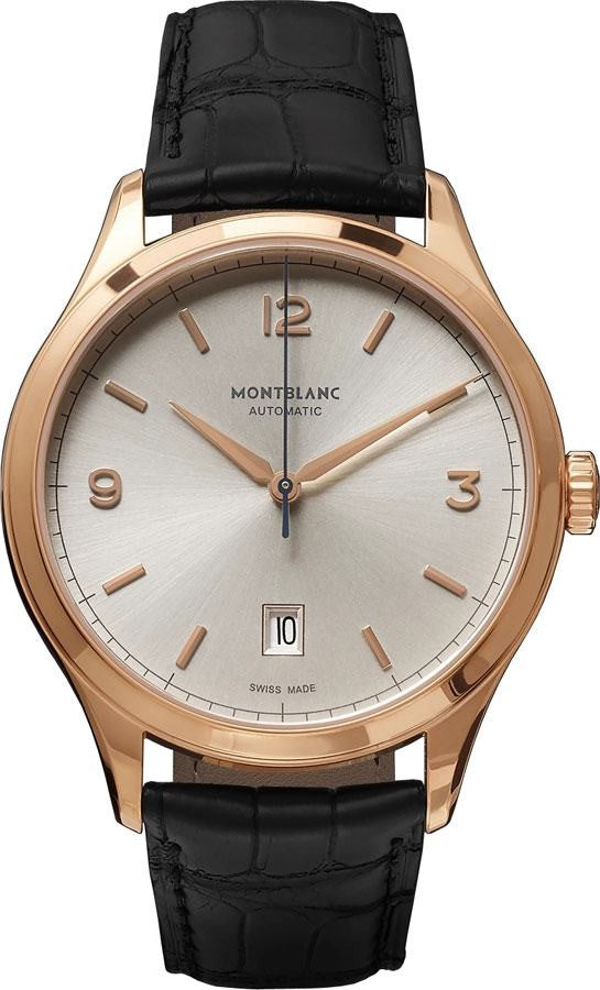 MontBlanc Heritage Chronometrie Automatic 114869 men's watch. Features a polished solid 18k rose gold case with fixed bezel and comes on a black Leather Strap with Pattern. The silvery white dial features rose gold coated indexes and Arabic numeral hour markers. The date is displayed at 6 o'clock. Powered by the MontBlanc Caliber MB 24.09 self-winding automatic movement which boasts a 42 hour power reserve, beats at 28,800 vph and contains 25 jewels. A flat scratch resistant sapphire crystal with anti-reflective coating protects the dial. The case is round, 40 mm in diameter, weights 65g and is 7.65 mm thick. Sapphire crystal exhibition case back. Inlet width: 20 mm. Push and pull crown. Solid 18k rose gold pin buckle. Water resistant to 30 meters / 100 feet. Dress watch style. Swiss made.