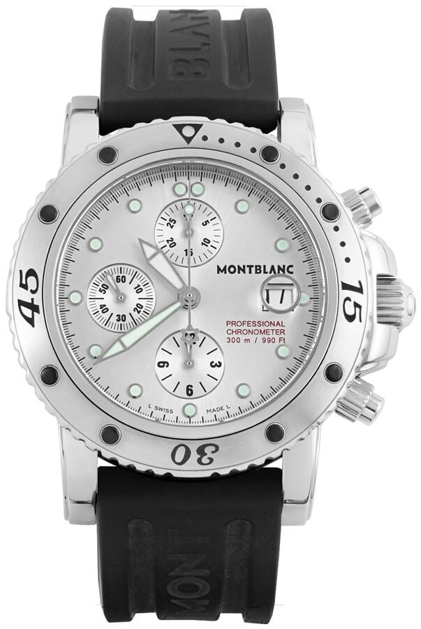 MontBlanc Sport Professional Chronometer Men's Watch 36917. This 44mm watch features a stainless steel case and bezel and is fitted with a black rubber strap. The silver dial has index hour markers, a date window displayed at 3 o'clock, and a chronograph. It is powered by a self-winding automatic COSC Chronometer certified movement.