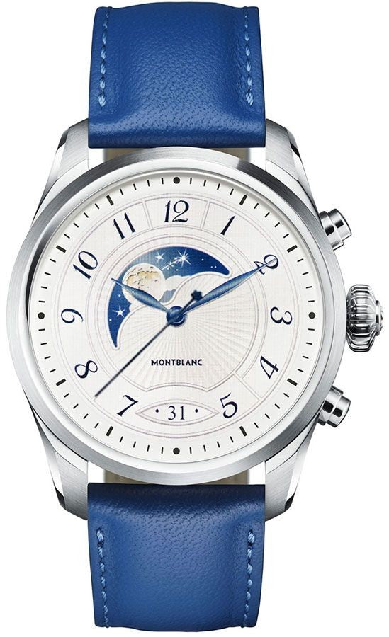 MontBlanc Summit 2 Stainless Steel and Leather 119722 men's smartwatch. Features a full circle AMOLED display. Screen size: 1.2" = 30.48mm. Screen resolution: 390 x 390 (327ppi). Brushed with polished stainless steel case and Sapphire Blue calfskin leather strap. Brushed with polished stainless steel fixed bezel. Chronograph. Altimeter, Heart rate monitor. Microphone. Accelerometer. Gyroscope. Ambient Light Sensor. 1 GB memory, 8 GB storage. Operating system: Wear OS by Google. Processor: Qualcomm Snapdragon Wear 3100. Exclusive MontBlanc apps. Connectivity: Bluetooth 4.2, Wi-Fi (802.11b/g 2.4GHz) with GPS and NFC Payment enabling Google Pay. Compatibility: iOS 9.3+ and Android 4.4+ (excluding Go edition). Rechargeable battery operated quartz movement. Power: 340 mAh = one full day, 4-5 extra days in Time Only Mode. Includes magnetic charging base and USB cable. A scratch resistant sapphire crystal protects the screen. The case is round, 42mm in diameter, weighs 62g and is 14.3mm thick. Inlet size: 22mm. Glass and fiberglass resin case back. Push and pull crown. Programmable pushers. Stainless steel deployment buckle. Water resistant to 50 meters / 165 feet. Functions: chronograph, altimeter, heart rate monitor, accelerometer, microphone, gyroscope, ambient light sensor, GPS, NFC Payment (Google Pay). Sport watch style. Swiss made.