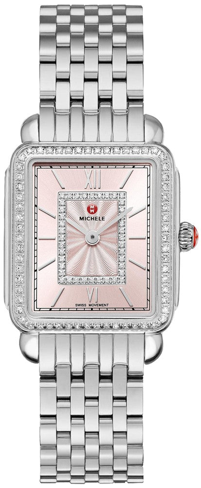 The Michele Deco II Mid MWW06I000031 is a stunning timepiece with a polished stainless steel case and bracelet. Its blush sunray pink dial is adorned with diamonds, while the fixed bezel is also set with diamonds. This watch runs on a battery operated quartz movement and can withstand water pressure up to 50 meters. With a case size of 26mm x 27mm and a 16mm inlet for the bracelet, this piece exudes elegance and sophistication. aka 6I31