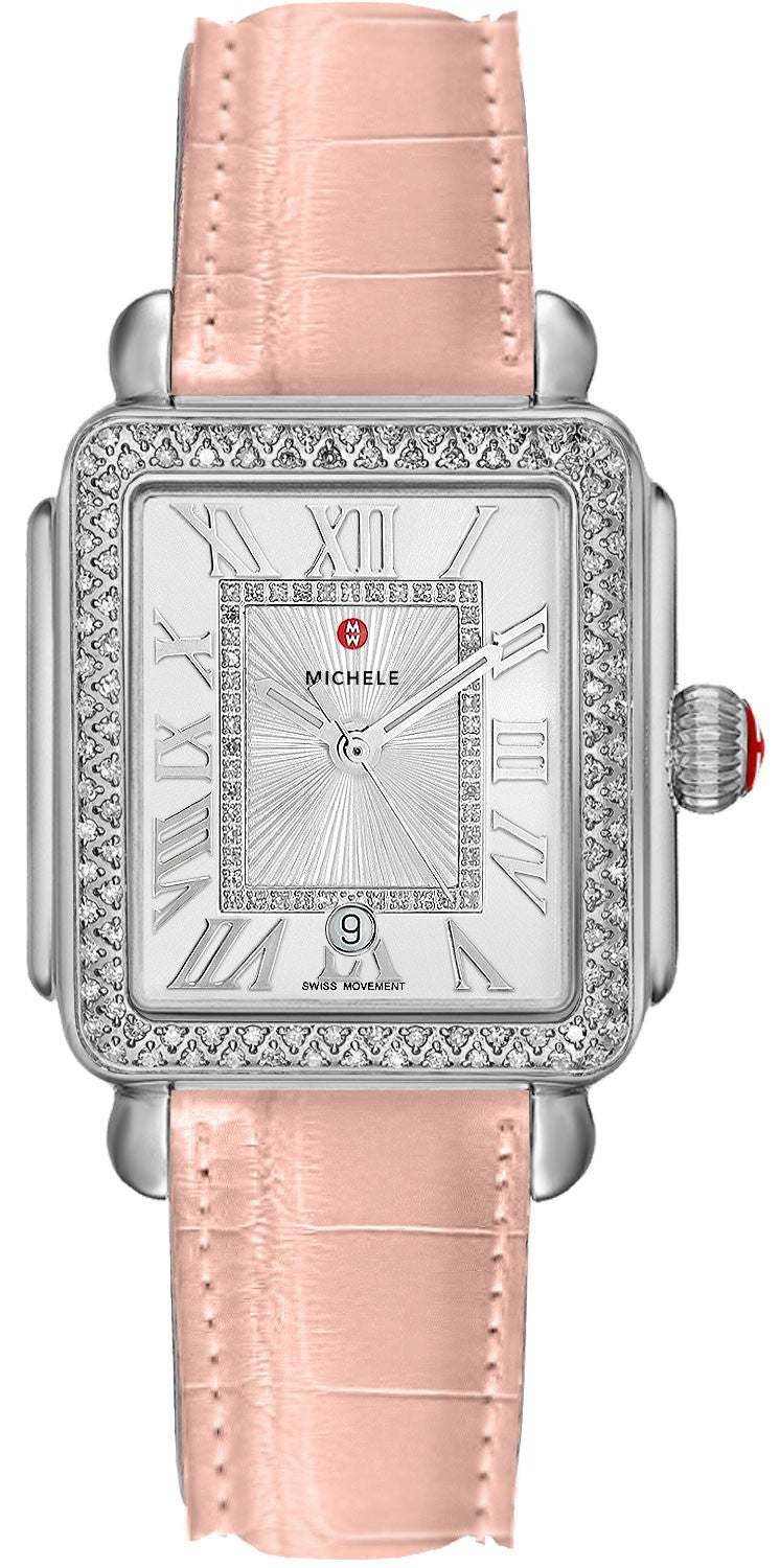 The Michele Deco Madison MWW06T000173 is a sophisticated watch with a polished stainless steel case and a blush pink Leather Strap with Pattern. Its sunray silver white dial is adorned with diamonds and includes a date window at the 6 o'clock position. The watch also features luminescent hands and a fixed bezel with diamonds. Powered by a battery operated quartz movement, it is water resistant up to 50 meters. The case size is 33mm x 35mm with an 18mm inlet for the strap. aka 6T173