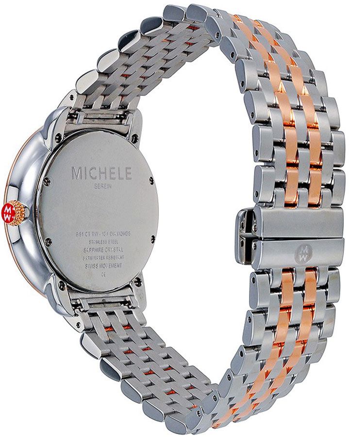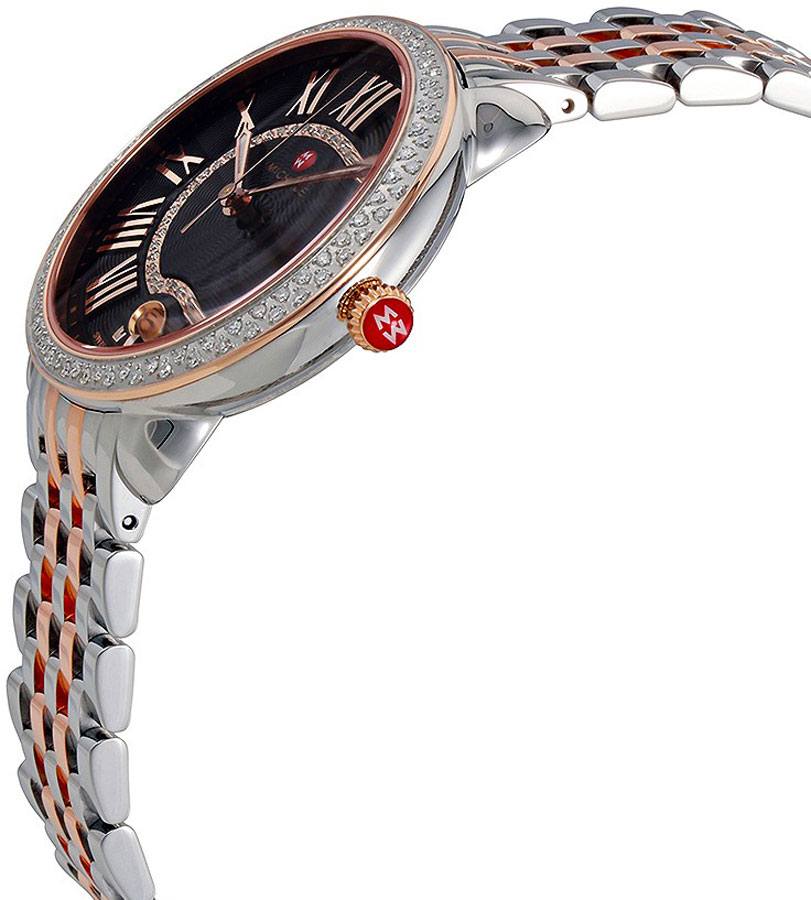 Discover the elegant Michele Serein Mid Diamond Women's Watch MWW21B000094. This stylish timepiece features a polished stainless steel case and a rose gold and steel bracelet, with a fixed bezel adorned with dazzling diamonds. The textured black dial also shines with diamonds, totaling 0.61 carats. Effortlessly read the time with luminescent rose gold hands and Roman numeral hour markers. The date is conveniently displayed in a window at 6 o'clock. Powered by a battery operated quartz movement, this watch also boasts a scratch resistant sapphire crystal. With a 36 mm x 34 mm round case and a 16 mm inlet width, this watch is both sleek and functional. Plus, the stainless steel deployment buckle ensures a secure fit. Take this Swiss made watch on any adventure - it is water resistant up to 50 meters / 165 feet and functions for hours, minutes, seconds, and date. Elevate your style with this sophisticated fashion watch. aka 21B94
