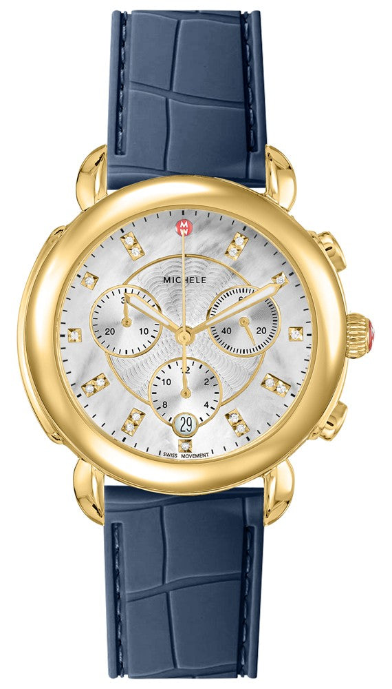 Discover elegance with the Michele Sidney MWW30A000021. The timepiece boasts a polished 18k yellow gold plated case, a fixed bezel, and a navy embossed silicone strap. Its round mother of pearl dial shimmers with diamonds and features a chronograph and date window at 6 o'clock. The hands are luminescent, and the watch is powered by a battery-operated quartz movement. It is also water resistant up to 50 meters, with a case size of 38mm and an 18mm strap inlet. aka 30A21