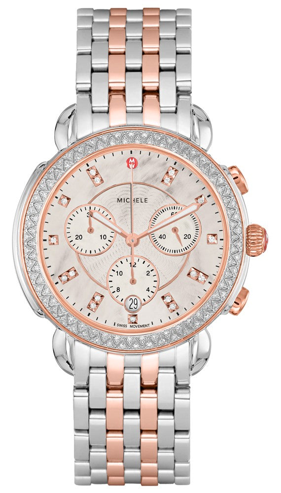 Expertly crafted with a classic and elegant design, the Michele Sidney Rose Gold Two-Tone Diamond Women's Watch is a stunning accessory for any occasion. Featuring a perfectly balanced two-tone color palette and sparkling diamonds, this watch adds a touch of luxury and sophistication to your outfit. Own a timeless piece with this Michele timepiece. aka 30A36