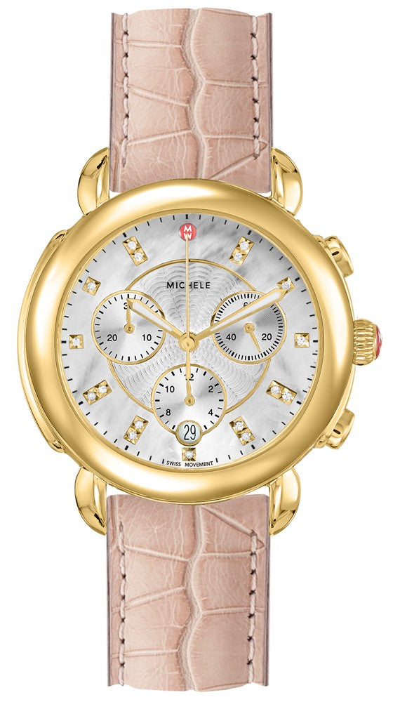 The Michele Sidney MWW30A000038 is a sophisticated choice with its polished 18k yellow gold plated case and round white mother of pearl dial adorned with diamonds. The fixed bezel, chronograph feature, and luminescent hands add functionality to this timepiece. For a touch of elegance, it is paired with a blush pink leather strap with a unique pattern. Powered by a precision quartz movement, it is also water resistant up to 50 meters. Measuring at 38mm in case size with an 18mm inlet for the strap, it is a stunning and practical option for any occasion. aka 30A38