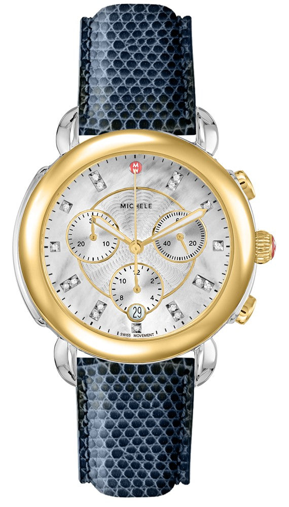 The Michele Sidney MWW30A000039 timepiece boasts a polished stainless steel case and a round white mother of pearl dial adorned with diamonds. The polished 18k yellow gold plated bezel adds a touch of luxury, while the chronograph feature and date window at the 6 o'clock mark enhance its functionality. Luminescent hands and a navy leather strap with lizard pattern complete the look. Powered by a battery operated quartz movement, this piece is water resistant up to 50 meters and has an overall case size of 38mm with an 18mm inlet for the strap. aka 30A39