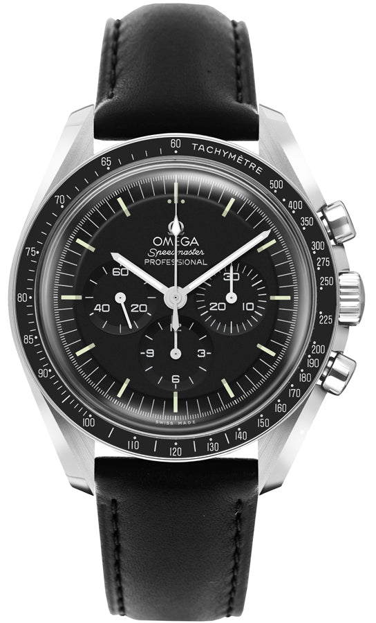 The Omega Speedmaster Moonwatch Professional Men's Watch 310.32.42.50.01.002 boasts a 42mm stainless steel case and a sleek black leather strap. Its black anodised aluminum bezel ring perfectly complements the black dial, which features luminescent hands and hour markers along with a chronograph. This watch is powered by the precise Omega Caliber 3861 manual winding COSC Master Chronometer certified movement with co-axial escapement and a 50-hour power reserve.