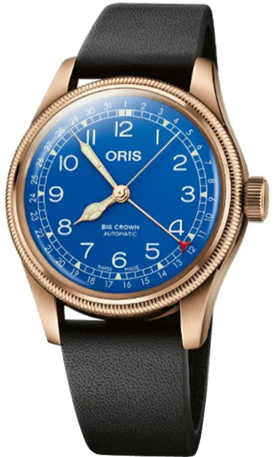 Oris Big Crown Mare Nostrum Blu Men's Watch 75477413185LS. This 40mm limited edition watch features a bronze case and a black leather strap with a bronze tang buckle. The blue dial has Arabic numeral hour markers and has a date feature indicated by a red-tipped hand. It is powered by the Oris Caliber 754 self-winding automatic movement with a 38-hour power reserve.