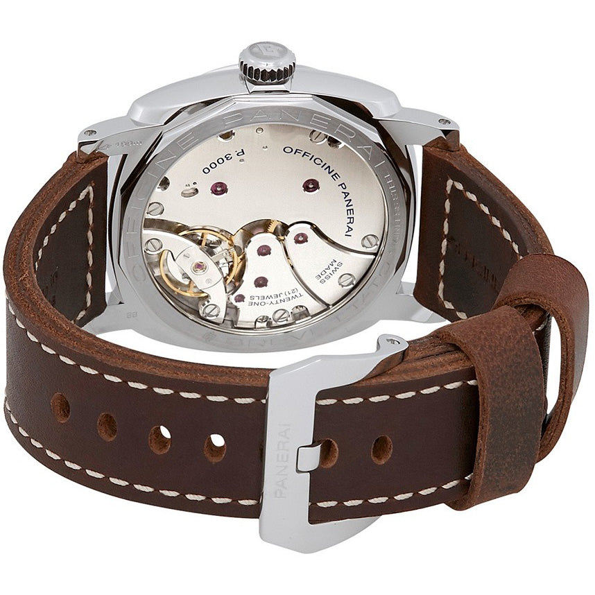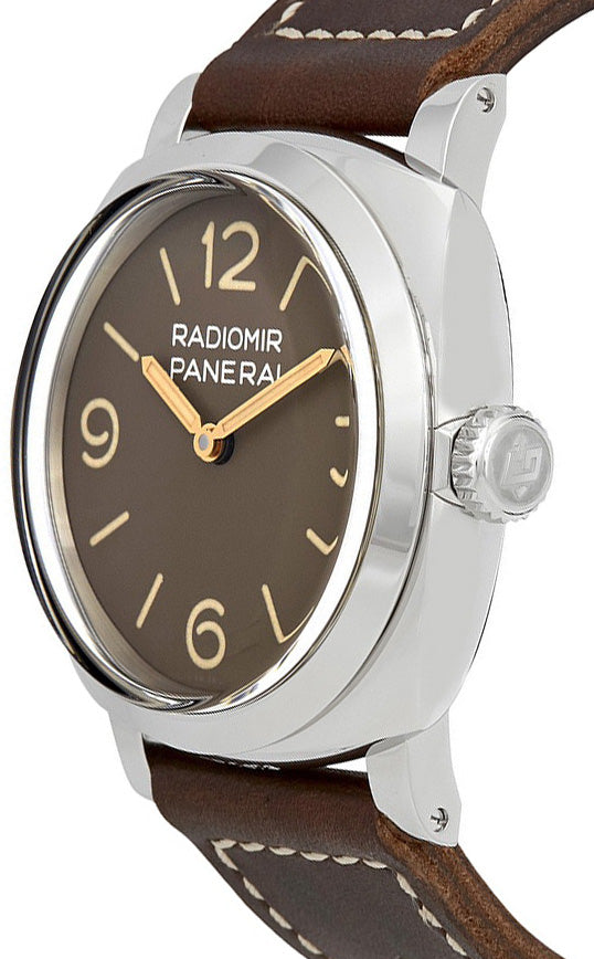 Panerai Radiomir PAM00662 hand wound men's watch. Limited Edition, Numbered out of 1000 made. Features a polished stainless steel case and brown leather strap with white stitching. Polished stainless steel fixed bezel. The brown dial features rose gold tone hands and hour markers. Superluminova-filled markers, hour and minute hands. This timepiece has a analog display and a cushion case shape. Powered by the Panerai Caliber P.3000 Hand-winding manual movement which boasts a 72 hour power reserve. An ultra-curved scratch resistant sapphire crystal with anti-reflective coating protects the dial. The case is round and 47 mm in diameter with an inlet size of 26mm. Sapphire crystal exhibition see through case back. Screw down crown and stainless steel tang buckle. Water resistant to 100 meters / 330 feet. Casual watch style. Swiss made.