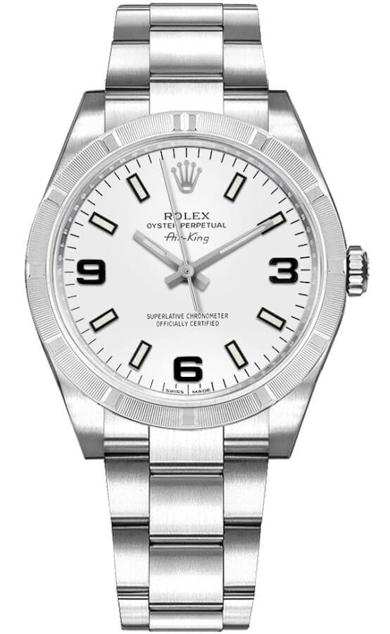 Discover precision and elegance with the Rolex Oyster Perpetual Air-King White Dial Women's Watch 114210. Measuring at 34mm, this timepiece showcases a durable stainless steel case and Oyster bracelet. The engine-turned bezel adds a touch of sophistication, while the luminescent hands and index hour markers with Arabic numerals at 3, 6, and 9 o'clock make for easy timekeeping. Powered by the certified Rolex Caliber 3130 self-winding automatic movement, this watch boasts a 48-hour power reserve to keep you on-time and on-the-go.