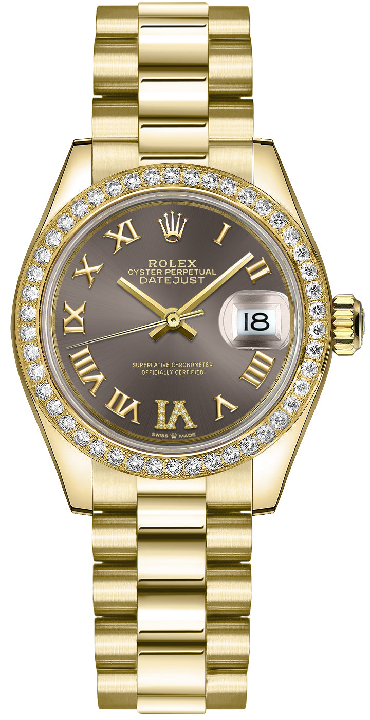 Experience timeless elegance with the Rolex Datejust 31 278288RBR-0026. This exquisite timepiece features a luxurious 18k yellow gold case and president bracelet, exuding sophistication and style. The diamond bezel adds a touch of glamour, while the dark grey dial and roman numeral hour markers with diamond VI create a striking contrast. With automatic movement and chronometer precision, this watch seamlessly combines beauty and functionality. The concealed crownclasp ensures a seamless look on the wrist. Elevate your look with this stunning Rolex timepiece that is sure to make a statement.
