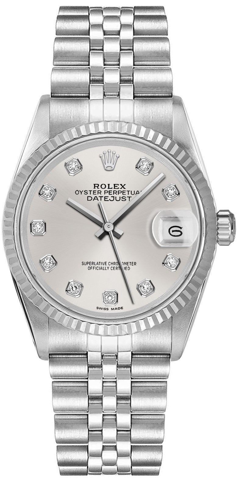 Embrace the allure of classic grace with the Rolex Datejust 31 78274. This exceptional wristwatch showcases a dazzling silver dial embellished with glittering diamond hour markers, accompanied by a convenient date display. The 31mm stainless steel case is enhanced by an 18k white gold fluted bezel, exuding opulence. The jubilee bracelet provides a comfortable fit and can be easily secured with a deployment buckle. Driven by an automatic movement, this chronometer-certified timepiece seamlessly blends precision and elegance for a refined aesthetic that will endure.