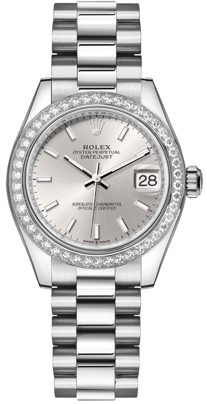 The Rolex Datejust 31 for women (278289RBR-0012) is a sophisticated timepiece with a redesigned Oyster Perpetual case made of solid 18k white gold. It is powered by the new-generation calibre 2236 and has received the Superlative Chronometer certification. The watch features a silver dial with index hour markers and a bezel adorned with diamonds, revealing the date at 3 o'clock. With a water resistance of up to 100 meters/330 feet and a polished and brushed solid 18k white gold President bracelet, it offers an approximate power reserve of 55 hours.