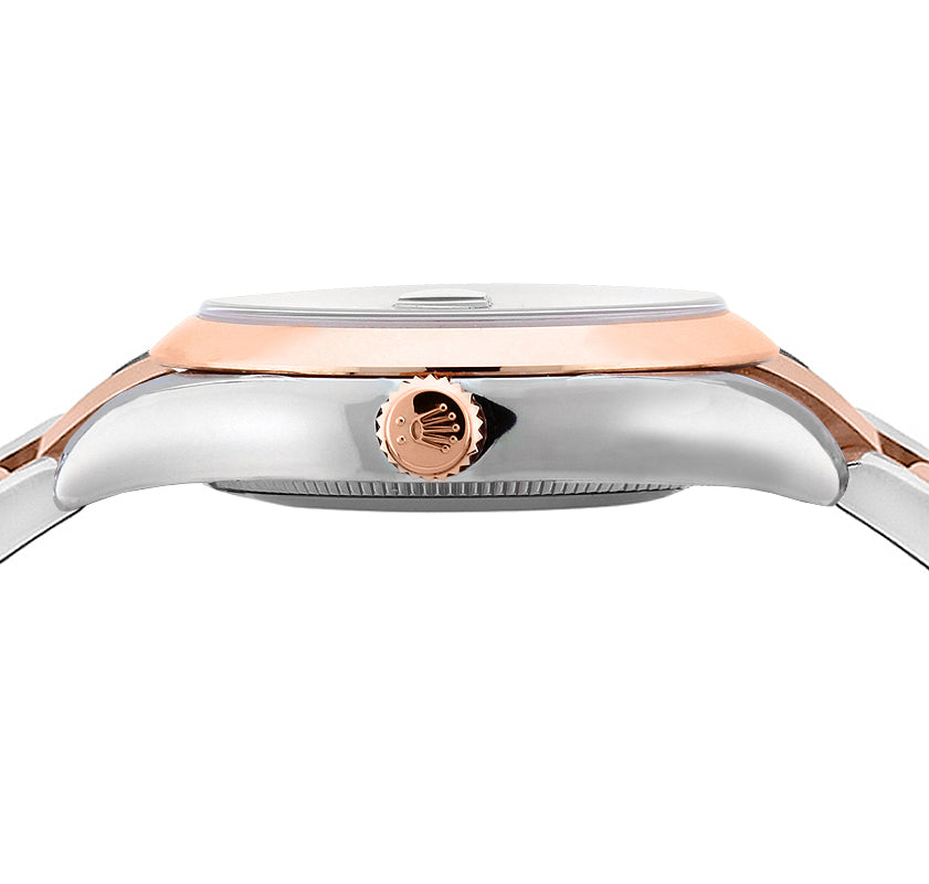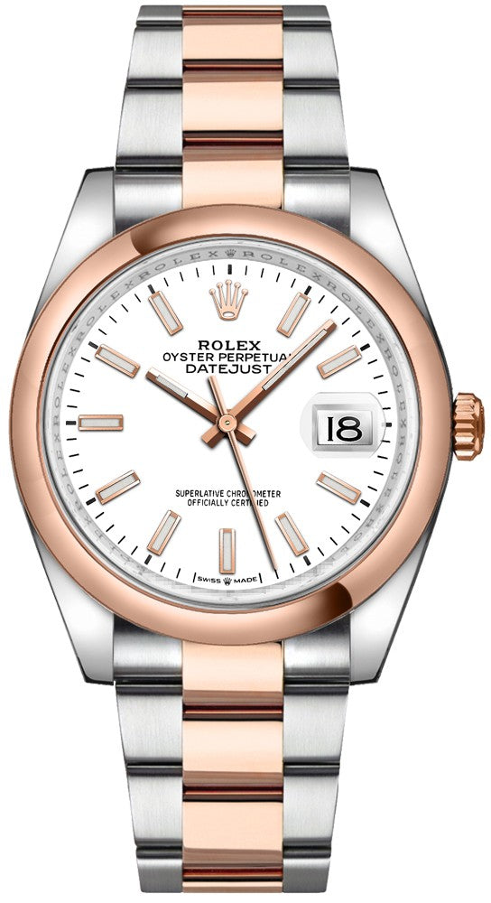 Experience the superior craftsmanship of the Rolex Datejust 36 White Dial Index Hour Markers Watch 126201-0018. With a sleek polished 904L Oystersteel stainless steel case and a brushed 904L Oystersteel stainless steel bracelet, this watch exudes luxury and sophistication. The domed fixed bezel in solid 18k everose gold adds a touch of elegance to the design. The white dial features luminescent hands and index hour markers, with a date window displayed under the convenient cyclops lens at 3 o'clock. Powered by the advanced Rolex Caliber 3235 self-winding automatic COSC Superlative Chronometer certified movement, this watch boasts a remarkable 70 hour power reserve and beats at 28,800 vph for precise timekeeping. The scratch-resistant sapphire crystal protects the dial, while the screw down crown, Twinlock double waterproofness system, and screw down case back ensure durability and water resistance up to 100 meters.