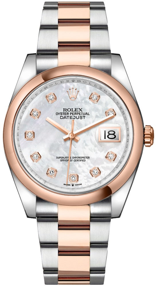The Rolex Datejust 36 Mother of Pearl Oyster Bracelet Watch 126201-0022 is suitable for both men and women. It features a polished 904L Oystersteel stainless steel case and a brushed 904L Oystersteel stainless steel bracelet with polished solid 18k everose gold accents. The polished solid 18k everose gold domed bezel adds a touch of elegance. The white Mother of Pearl dial is adorned with diamond hour markers and features a date window at 3 o'clock with a cyclops lens for easy reading. The watch is powered by the precise and reliable Rolex Caliber 3235 automatic COSC Superlative Chronometer certified movement with a 70-hour power reserve. Protected by a scratch-resistant sapphire crystal, this 36mm round watch is waterproof up to 100 meters/330 feet and equipped with a screw-down crown and case back for added water resistance.