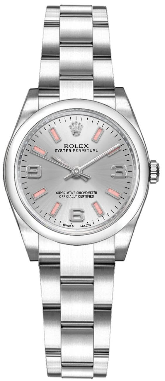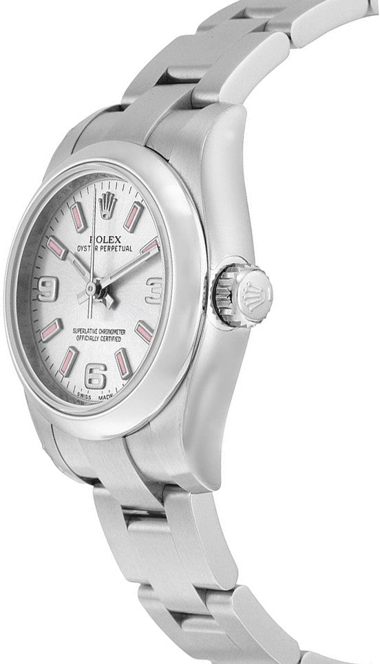Discover the unmatched value of the Swiss-made Rolex Oyster Perpetual Women's luxury watch model 176200. Featuring a brushed and polished 904L stainless steel case, screw-down crown and case back, and brushed 904L stainless steel oyster bracelet with stainless steel oysterclasp deployment buckle, this watch exudes both style and durability. A stunning silver dial showcases luminescent hands and pink index hour markers, as well as Arabic numerals 3, 6, and 9, all protected by a scratch-resistant sapphire crystal and enclosed by a polished stainless steel domed bezel. With Self-winding automatic movement and a 48-hour power reserve, this essential timepiece is a must-have for any watch enthusiast.