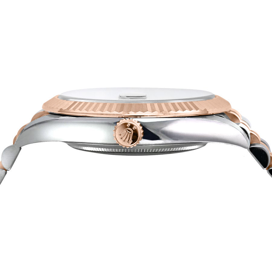 The Rolex Datejust 36mm M116231 is an authentic Swiss-made luxury watch for both men and women. It features a polished stainless steel case made with Oystersteel and a two-toned brushed Oystersteel and 18k Everose gold jubilee bracelet with concealed folding oysterclasp deployment buckle. The black diamond dial includes a date aperture at the 3 o'clock position and is surrounded by a polished 18k Everose gold fluted bezel. This exquisite timepiece runs on a COSC Superlative Chronometer Certified Self-winding automatic movement with a 48 hour power reserve.