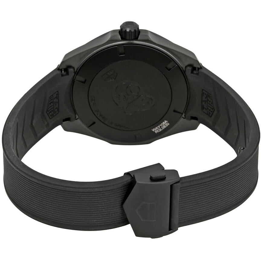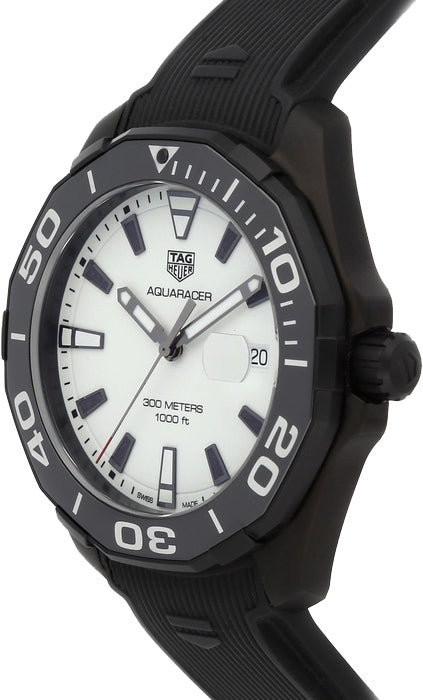 The TAG Heuer Aquaracer Nightdiver WAY108A.FT6141 Men's Watch is a professional and reliable choice for diving enthusiasts. It boasts a sturdy brushed and polished black PVD titanium grade 2 case and a durable black rubber strap. The black aluminum unidirectional rotating bezel features a 60 minute scale, while the white textured dial displays luminescent hour and minute hands, along with hour markers at 3, 6, 9, and 12 o'clock. A magnifying lens enhances the visibility of the date at 3 o'clock. This watch is powered by a battery operated quartz movement and is protected by a flat, scratch-resistant sapphire crystal with anti-reflective treatment. The 43mm round case has a screw-down crown and case back, and the brushed black PVD titanium grade 2 folding clasp ensures a secure fit with double safety push-buttons and a diving extension.