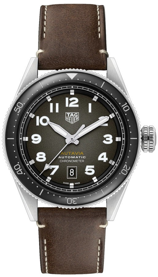 Expertly designed and crafted, the Tag Heuer Autavia Calibre 5 Chronometer Men's Watch WBE5114.FC8266 is a must-have for any watch enthusiast. Precisely constructed with a stainless steel case and a durable brown calfskin leather strap, this timepiece exudes a sense of luxury and refinement. The polished black ceramic bidirectional rotating bezel adds a touch of sophistication, while the smoky black dial features luminescent hands and Arabic numeral hour markers for easy time-telling. Equipped with the Tag Heuer Caliber 5 self-winding automatic COSC Chronometer certified movement, this watch has a 38 hour power reserve and beats at 28,800 vph, with 25 jewels for smooth and accurate timekeeping. The scratch resistant sapphire crystal with anti-reflective treatment protects the dial, while the round 42mm case and Autavia special decoration engraved on the case back showcase the brand's superior craftsmanship.