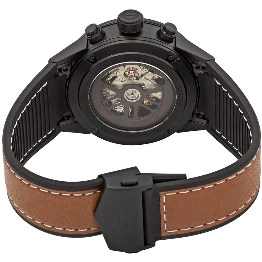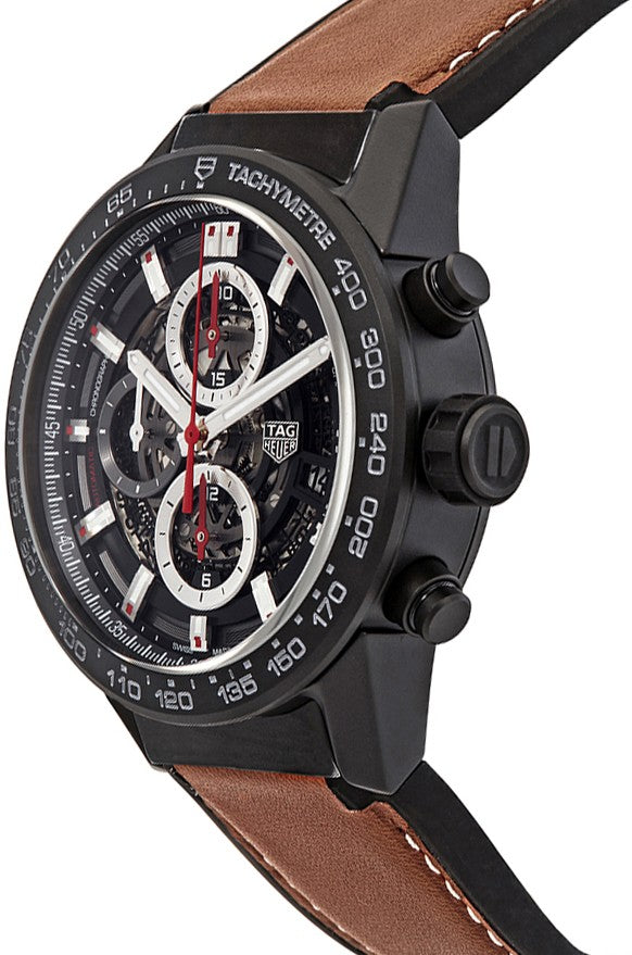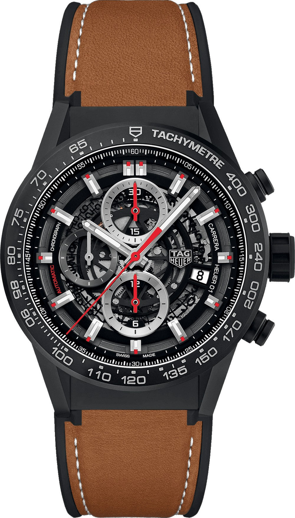 Experience true luxury with the Tag Heuer Carrera CAR2090.FT6124 men's watch. Its sleek design features a matte black ceramic case, black rubber strap with brown calfskin leather outer lining, and a matte black ceramic fixed bezel engraved with tachymeter scale. The black skeleton dial showcases luminescent hands, index hour markers, and a black flange with 60 seconds and minute scale. A date window is conveniently located between 3 and 4 o'clock. This watch also boasts a column-wheel chronograph with a large red central chronograph seconds hand, 30 minute counter sub-dial at 12 o'clock, and 12 hour counter sub-dial at 6 o'clock. With a small seconds sub-dial at 9 o'clock, the Tag Heuer Caliber Heuer 01 self-winding automatic movement promises a 50 hour power reserve, beats at 28,800 vph, and contains 39 jewels.