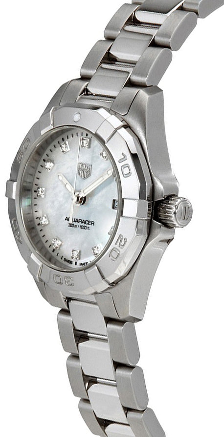 This Tag Heuer Aquaracer women's watch features a 27mm diamond-encrusted case and bracelet, as well as a precise quartz movement. Its sleek design and durable materials make it perfect for both formal occasions and everyday wear. Experience luxurious style and reliable timekeeping with this stunning watch.